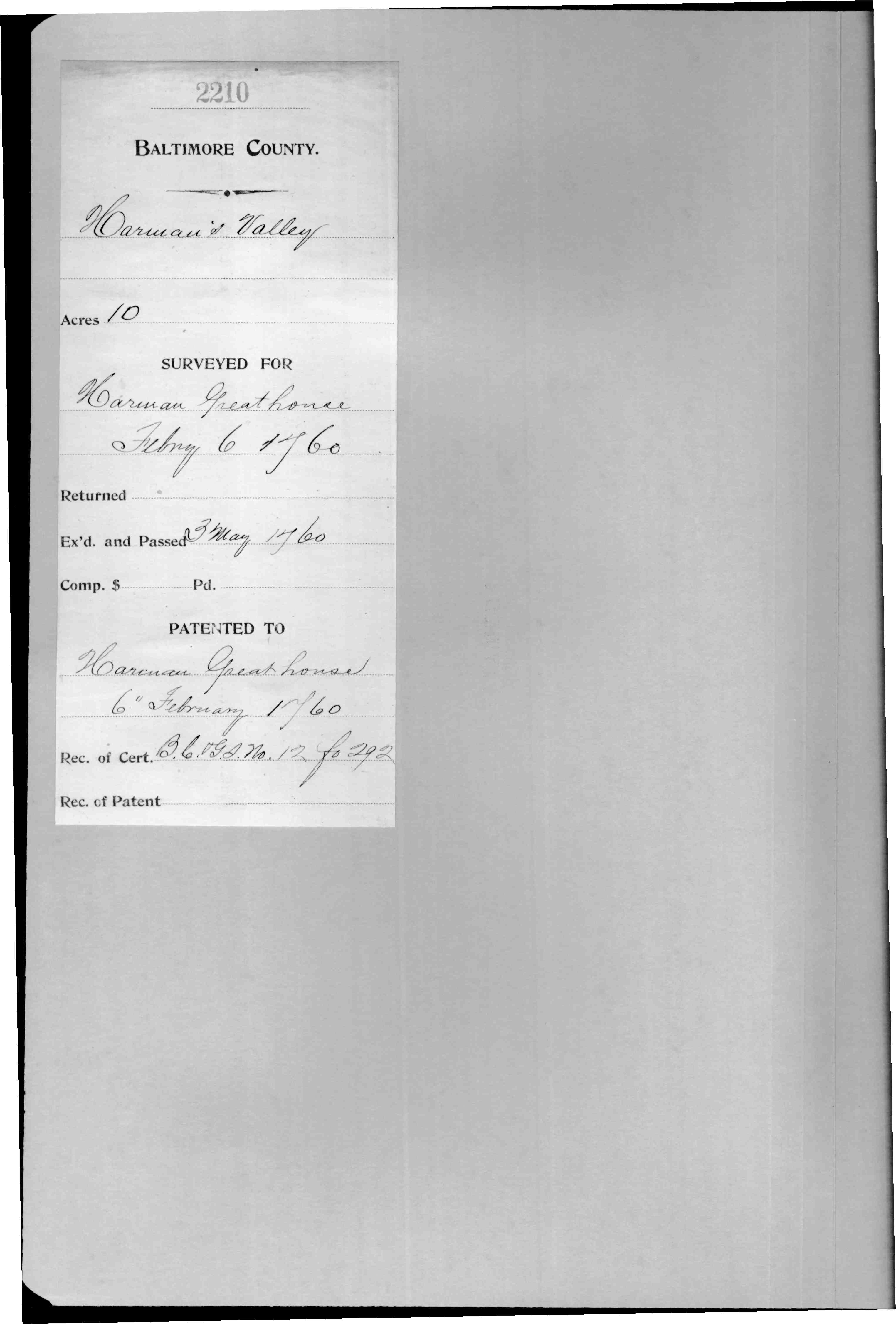 1759, Nov 21 - Land: Harman Greathouse, Harmans Valley Robert Marshall to Harman Greathouse } Warrant [ Page 2 | Page 3 ] Baltimore County vis. By Virtue of a Common Warrant granted out of his Lordships Land Office on the 9th day of August 1759, to lay out for Robert Marshall of Ann Arundle County 10 acres of land, which Warrant was on the 21st day of November 1759, assigned by the said Robert Marshall unto Harman Greathouse of Baltimore County... I Nicholas Ruxton Gay Deputy Surveyor of Baltimore County have Surveyed & laid out for & in the name of him the said Harman Greathouse a tract or parcel of Land lying & being in the County aforesaid, Beginning at a bounded White Oak Standing on the Southside of the Piney falls & Running thence North twenty one degr. West fourteen perches, North Eighty three degr. West eighteen perches, North twenty one degr. West Seventeen perches, South twenty Six degr.ees West thirty two perches, South Seventy degr., West twenty six perches, South twenty Six degr., West thirty five perches, south fifty Seven degr., East fourthee perches, North twenty degr., East thirty perches, North eighty seven degr., East twenty perhces, north fifty eight degr., East thirty two perches and then with with a Straight line to the begining containing & laid out for Ten Acres more or less to be held of the Manor of Baltimore by the name of Harmans Vally, February the 6th 1760. NRuxton Gay DSBC Platted to a scale of 100 Ps in an inch Certificate No. 2210 [ Page 1 ] Baltimore County; Harmans Valley; acres: 10; Surveyed for Harman Greathouse, February, 6, 1760; Ex'd and Passed: 3 May 1760; Patented to Harman Greathouse, 6 February 1760; Rec. of Cert.: B.C. & G.S. No. 12, Fo. 292. Tract Index references survey and patent certificate as: Reference: Patent Record BC and GS 12, p. 292 Reference: Patent Record BC and GS 13, p. 505 Footnotes:
