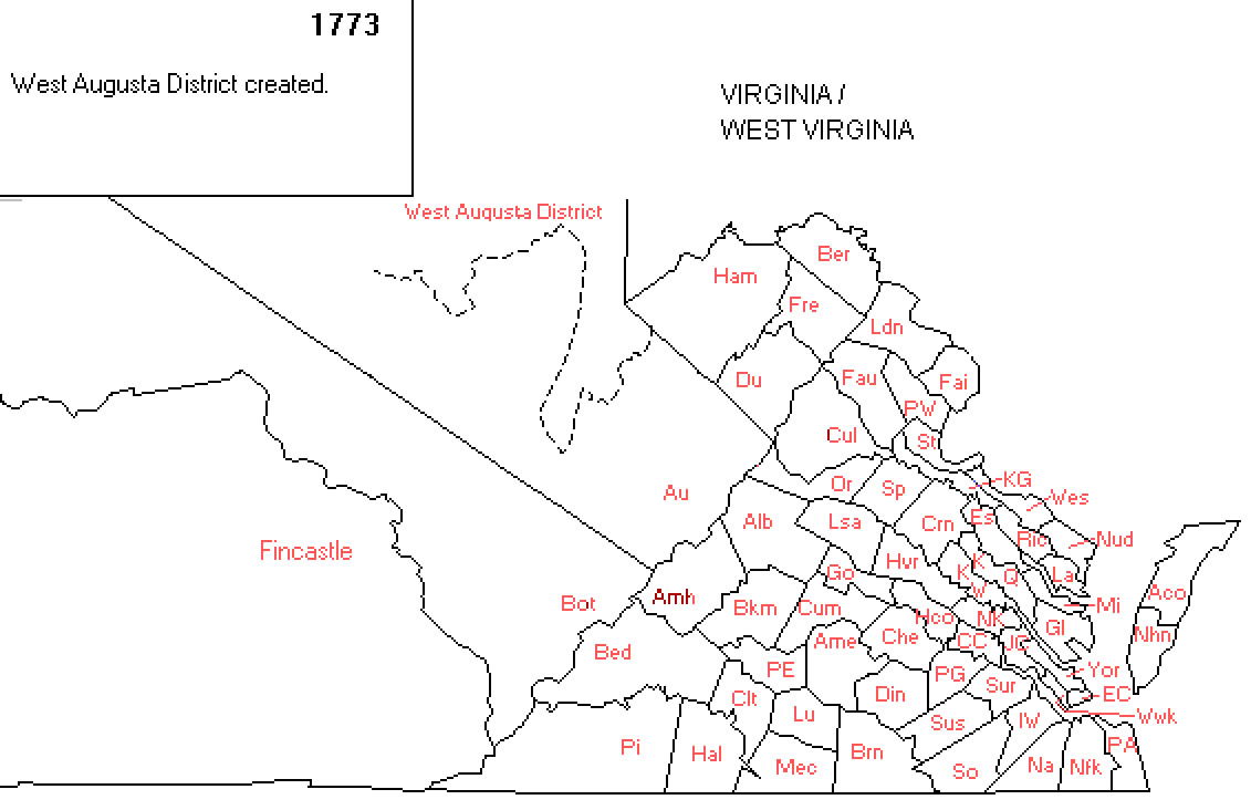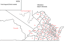 1773, Oct 11 - WEST AUGUSTA DISTRICT created by Virginia from AUGUSTA. WEST AUGUSTA DISTRICT overlapped territory claimed by Pennsylvania. (Abernethy, 94) Map: Pennsylvania/Virginia Map 1773 - 1776, showing land which was in dispute between the two states.