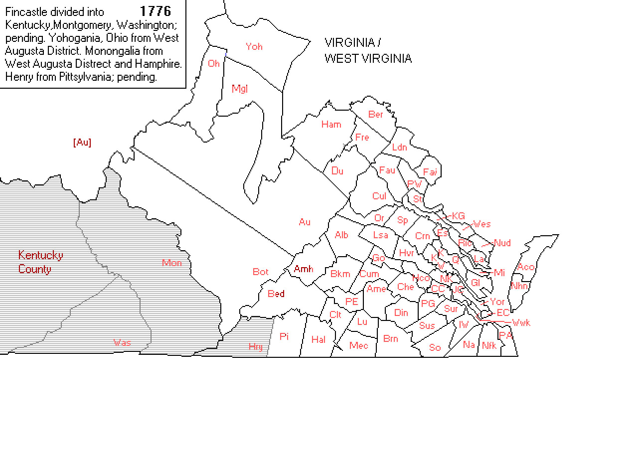 1776, Nov 8 - District of West Augusta was abolished by Virginia upon the creation of MONONGALIA (W.Va.), OHIO (W.Va.) and YOHOGANIA (W.Va.) from West Augusta District and HAMPSHIRE (W.Va.); MONONGALIA, OHIO and YOHOGANIA overlapped territory claimed by Pennsylvania. (Cappon, Petchenik, and Long, 93; Hening, 9:262-274)