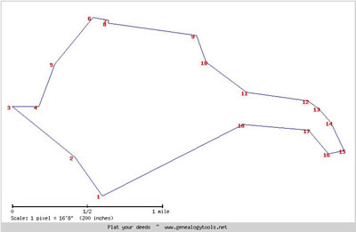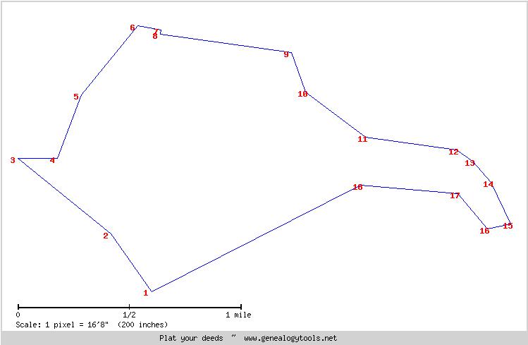 1783, Dec 11 - Survey: Harmon Greathouse, Harmons Creek, 800 acres Excerpt from 1785 - Land Grant: Harmon Greathouse, Harmons Creek, 800 acres: there is granted by the said Commonwealth unto the said Harmon Greathouse a certain Tract or parcel of Land Containing Eight hundred acres by Survey bearing date the eleventh day of December one Thousand seven hundred and Eighty three [11 Dec 1783] Lying and being in the County of Yohogania and is Bounded as followeth. To wit: Beginning at a Large Double Sycamore on the north side of Harmons Creek being a Corner to Thomas Edgington 1) thence North thirty five degrees West one hundred poles to a Black oak on the hill N 35 degrees W 100 poles 2) thence with Edgingtons Line North fifty one Degrees West one hundred and Seventy two poles to a Black oak Corner to Thomas Edgington, N 51 degrees W 172 poles 3) thence East fifty seven poles to a Black oak on the River Hill E 57 poles 4) thence North Twenty one degrees East ninety seven poles to a white oak N 21 degrees E 97 poles 5) thence North thirty nine degrees East one hundred and Twenty eight poles to a white oak N 39 degrees E 128 poles 6) thence south seventy eight degrees East thirty four poles to a white oak in Alexander Wills Line S 78 degrees E 34 poles 7) thence with his Line South Twelve Degrees West six poles to his Corner Black oak S 12 degrees W 6 poles 8) thence with Wills Line crossing the cove of a Pond South Eighty two degrees East one hundred and ninety poles to a Black oak, S 82 degrees E 190 poles 9) thence south Twenty degree East sixty poles to a Dogwood and red oak on the north side of Harmons Creek S 20 degrees E 60 poles 10) South fifty three degrees East one hundred and seven poles to a Black Oak S 53 degrees E 107 poles 11) south Eighty two degrees East one hundred and Thirty two poles to a Large ash S 82 degrees E 132 poles 12) South fifty five degrees East Twenty eight poles to Slash oak S 55 degrees E 28 poles 13) south forty degrees East forty poles to a Sycamore S 40 degrees E 40 poles 14) south twenty degrees East Sixty six poles to a Sugar tree Corner to Gabriel Greathouse S 26 degrees E 66 poles 15) South Seventy eight degrees West thirty four poles to a maple on the South Bank of Harmons Creek just above an old Mill race S 78 degrees W 34 poles 16) thence North forty degrees West Sixty six poles to a swamp oak at the foot of the hill N 40 degrees W 66 poles 17) thence North Eighty five degrees West one hundred and forty poles N 85 degrees W 140 poles 18) thence right Line South fifty five degrees West three hundred and five poles to the Beginning With is appurtenances. S 55 [63] degrees W 305 [336] poles Footnotes: