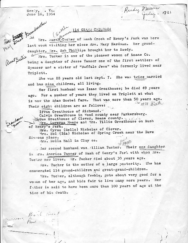 Szabo The Reedy News Reedy, , Va.1 114 GRAND CHILDREN Mrs. Sarah Tucker2 of Rush Creek of Henry’s Fork was here last week visiting her niece Mrs. Mary Hardman. Her grand-daughter, Mrs. Bob Phillips3, brought her to Reedy. Mrs. Tucker is one of the pioneer women of Roane Co., being a daughter of Jesse Tanner, one of the first settlers of Spencer and a sister of “Buffalo Jess” who formerly lived near Triplett. She was 88 years old last Sept. 7. She was twice married and has nine children, all living. Her first husband was Isaac Greathouse; he died 49 years ago. For a number of years they lived on Triplett at what is now the Adam Goebel farm. That was more than 50 years ago.4 Their eight children are as follows: